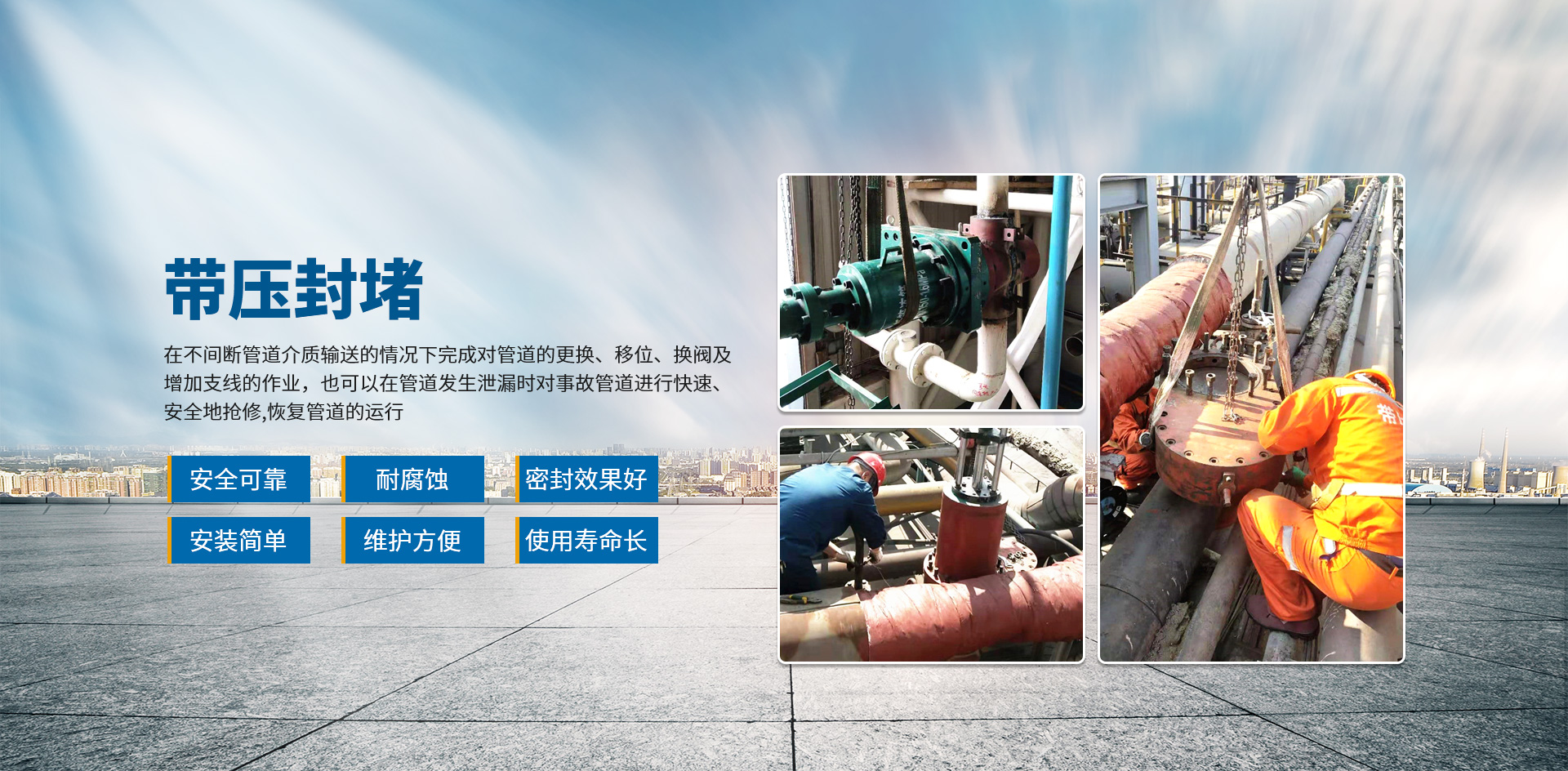 專業(yè)從事堵漏工程,管道設(shè)備維修,管道帶壓開孔,管道帶壓封堵,管道帶壓堵漏,管道設(shè)備清洗等業(yè)務(wù)。